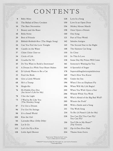 * The Bare Necessities * Beauty and the Beast * Can You Feel the Love Tonight * Cruella De Vil * A Dream Is a Wish Your Heart Makes * He’s a Tramp * I See the Light * I’ve Got No Strings * Let It Go * Mickey Mouse March * Some Day My Prince Will Come * Supercalifragilisticexpialidocious * Under the Sea * When You Wish Upon a Star * Zip-a-Dee-Doo-Dah * and more.