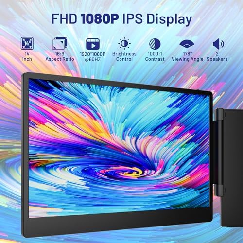📟Excellent Display Parameters– 14-inch HD display, 1000:1 contrast, IPS 1080P resolution, rich colors, better viewing experience, The laptop monitor extender can independently adjust the brightness, Stereo 2 speakers, contrast and other parameters. Flexibly adjust the screen rotation Angle 180 degrees, adjust the best viewing Angle at any time, whenever and wherever you can greatly enjoy the visual and audio dual experience.