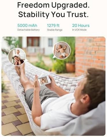 Long-Lasting Power, Endless Peace of Mind: Enjoy worry-free care with LumiView Plus. Powered by a 5000mAh removable battery, it offers up to 10 hours of continuous use and 14 hours on standby—keeping you connected through every nap and night. The easy-to-replace design ensures longer battery life and eco-friendly performance, while the strong signal range of up to 1,279 feet lets you move freely around your home, always within reach of your little one.