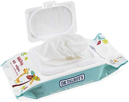 A sink and soap aren’t always available for cleanups. With Dr. Talbot’s Pacifier and Teether Wipes, you can clean your infant’s pacifiers, teethers, bottles, cups, or toys whenever they are dropped or soiled—all without needing water. Simply remove a wipe and wipe the item clean. It isn’t necessary to allow the cleansed item to air dry before use, so there is no wait on returning your little one’s pacifier to their mouth. Throw Dr. Talbot’s Pacifier and Teether Wipes in your diaper bag for convenient use on the go. Conveniently packaged in a 48-count pack, no matter where you go, you’ll be prepared whenever and wherever.