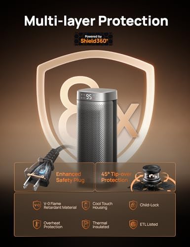 𝗨𝗻𝗺𝗮𝘁𝗰𝗵𝗲𝗱 𝗦𝗮𝗳𝗲𝘁𝘆 𝗮𝗻𝗱 𝗥𝗲𝗹𝗶𝗮𝗯𝗶𝗹𝗶𝘁𝘆: This indoor heater ensures top protection with the Shield360° system, including tip-over and overheat prevention, a 24-hour auto-off timer, and V-0 flame-retardant materials. It’s ETL-listed for certified safety.