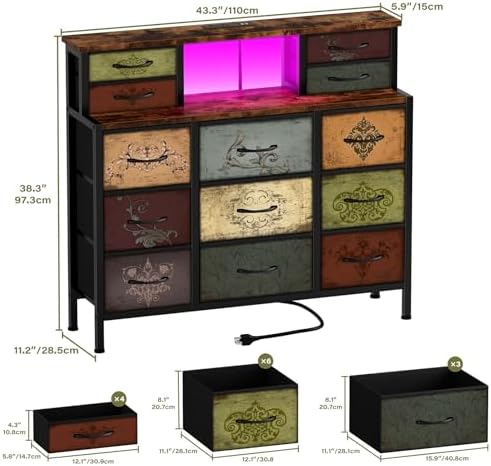 Organizer with Charging Station & LED Lights: Elevate your entertainment beyond just storage. This chest of drawers is a streamlined hub for your electronics, featuring a built-in charging station with 2 outlets and 2 USB ports to power your computer, console, makeup mirror and phones. Set the perfect ambiance with customizable LED lights, adjusting the color and brightness via the included remote to match your mood