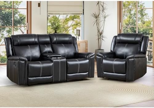 EBELLO Faux Leather Recliner Sofa Set, Includes a Manual Reclining 1 Seat Chair and a Loveseat Couch, Mid-Century Modern 3-Seater Furniture Set with Cup Holders and Storage, for Living Room, Black