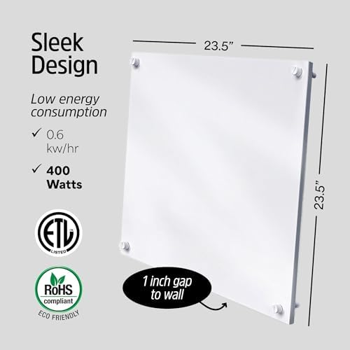 CONVECTOR HEATER SPECS: Ideal for a 120 sq. ft. room, 400 watts, 120 volts, 3.33 amps. Panel Heater Dimensions: 23.5 x 23.5 x ¼”. cETL approved. UL-2021 & RoHS compliant. HEAT REFLECTOR INCLUDED, temperature ranges between 41-86 °F. This unit may be HARD WIRED! OVERHEAT PROTECTION for your safety! We offer a 3 Year Manufacturer Warranty!