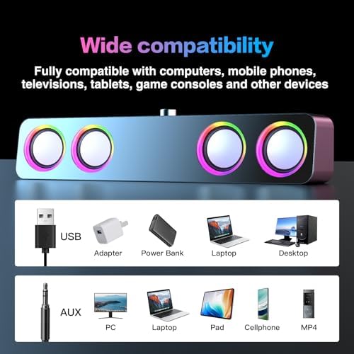 Wide Compatibility:This PC speaker is compatible with most devices featuring a 3.5mm AUX audio jack, including computers (desktops/laptops), tablets, CD players, and MP3 players. It requires simultaneous connection of a USB power cable and 3.5mm audio cable to ensure stable power supply and clear audio transmission