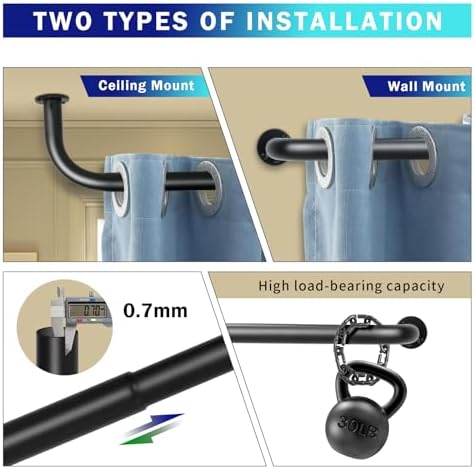 EASY SET-UP: All mounting hardare included, 1 telescoping curtain rod, screws, drywall anchors, and installation instructions. One additional center support bracket comes with 48″-84″ and 84″-120″ rod set. It can be wall or ceiling mounted indoor or outdoor. Install in mintes.