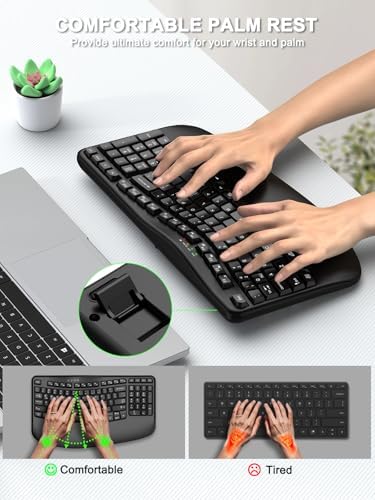 【COMFORTABLE PALM SUPPORT】: This ergonomic wireless keyboard is very suitable for medium to large-sized hands. The wide palm rest supports your wrists, allowing your hands to remain at the same level as the cordless keyboard, which reduces the stress during long typing sessions