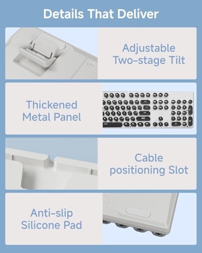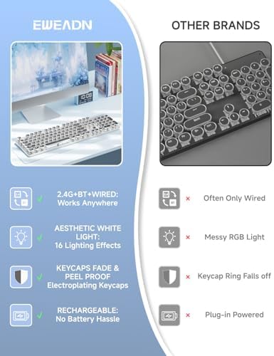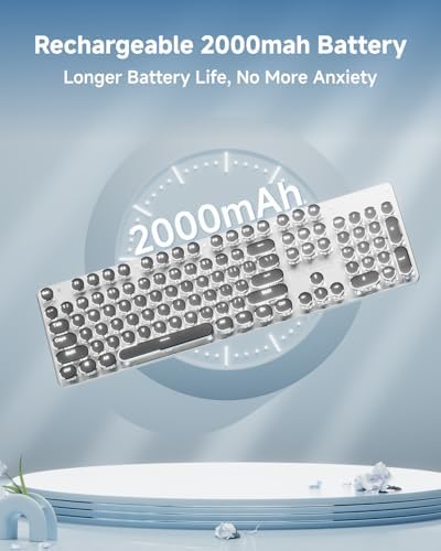 Retro Typewriter Style Round Keycaps: TK950 wireless typewriter keyboard uses double-shot injection retro punk round keycap with clear backlight, extremely durable. Stepped floating keycaps that fit your fingertips perfectly, precise position. Ergonomic foot support makes typing less tiring and more comfortable. Highly-durable mechanical blue switch responds faster and more quickly, accompanied by crisp click.