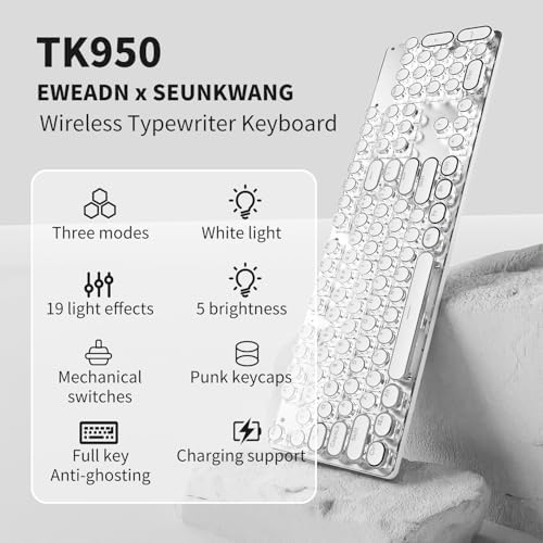 Retro Typewriter Style Round Keycaps: TK950 wireless typewriter keyboard uses double-shot injection retro punk round keycap with clear backlight, extremely durable. Stepped floating keycaps that fit your fingertips perfectly, precise position. Ergonomic foot support makes typing less tiring and more comfortable. Highly-durable mechanical blue switch responds faster and more quickly, accompanied by crisp click.