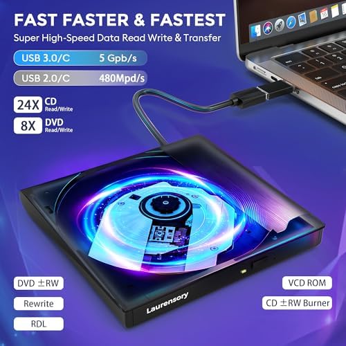 High Speed – This dvd player portable is compatible with USB 3.0 and USB 2.0 and USB 1.0, this cd reader for pc provides high speed of data transfer. With Max 8x DVDR Write Speed and Max 24x CD Write Speed, this external cd drive for pc provides maximum 5Gbps data transfer speed without lag or distortion. Plug this usb dvd player/cd dvd burner into your USB port, your laptop wwil recognize it without stuttering and noise nor jammed discs