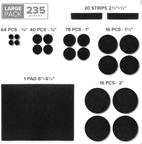 ✌️ HUGE QUANTITY OF FURNITURE PADS FOR ALL YOUR NEEDS – ALL SIZES AND MANY BIG FELT PADS – 235 pieces: (1) 4 1/3×6”, (20) 2½x½”, (16) 2”, (16) 1 ½, (78) 1”, (40) ¾”, (64) 3/8”. Furniture Pads for all home furniture and items!