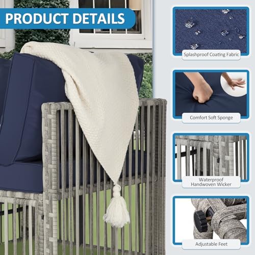 FHFO 7 Pieces Outdoor Patio Furniture Set, Wicker Outdoor Sectional Conversation Couch Set with Adjustable Backrest Sofa, Thick Cushion & Coffee Table for Garden, Porch, Poolside, Grey/Blue