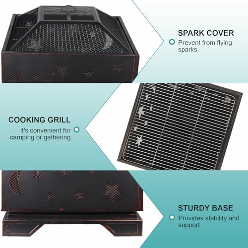 3 in 1 Design: 26-inch Square fire pit wood burning. Our fire pit with poker can be used as a fire place or bonfire, and also be used as an outdoor BBQ or as an ice bucket to keep beverages cold.