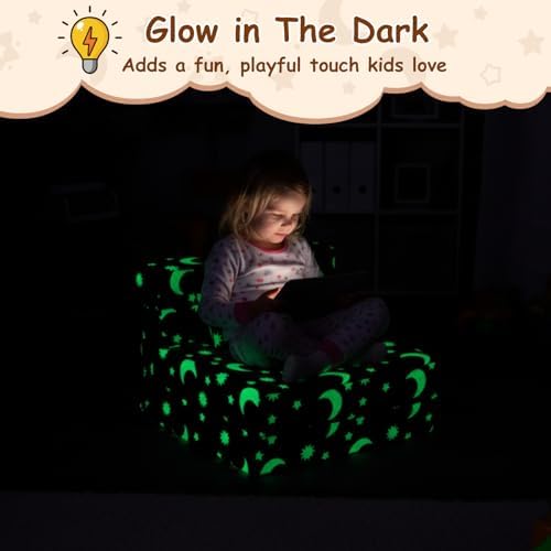 【Toddler Folding Sofa Bed Glow in The Dark】Unique luminous design. With exciting themes to choose from, including star, green dinosaur, rainbow, pink moon, and blue dinosaur. Simply place the toddler sofa under a bright light or sunlight for 10-15 minutes and bring it to a dark room to see the magic glow. The brighter the light shines, the stronger it glows in the dark.