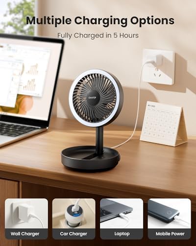 6000mAh Rechargeable Fan, Up to 20 Hours Runtime: Runs 4 to 20 hours per charge (less with light on), fully recharges in 5 hours. Whether you’re camping, traveling, or sleeping, enjoy reliable airflow without plugging in