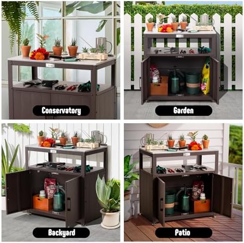 Ample Storage Space: 32″ x 18″ tabletop provides ample space for planting tasks or works. With a inner shelf featuring adjustable, the work bench with cabinet generates versatile storage for about 50 gallons, piece of cake to organize and store any tools