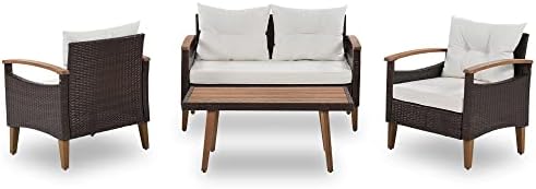 – [DURABLE MATERIALS] Made from acacia wood, the armrests, legs, and tabletop are built to last. The PE rattan and cushion material is resistant to water and UV, making it will last for years to come.
