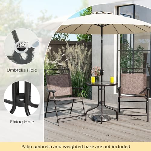 It includes a round table featuring a ripple-patterned tempered glass top that looks stunning and ensures durability and ease of maintenance. What’s more, the central hole in the bistro table is ready to accommodate an umbrella to cater to sunny and rainy days. The 2 provided chairs are foldable and easy to store. Not just portable, each chair is designed for your comfort with ergonomic backrest, armrests, and breathable fabric. Supported by a robust metal frame with adjustable foot pads, the patio furniture set promises both stability and adaptability to uneven surfaces. Perfect for patio, garden, poolside and more, the conversation set enhances your space and adapts to your lifestyle, promising year-round enjoyment outdoors. To extend the lifespan of the product, it is not recommended to expose it to rain.