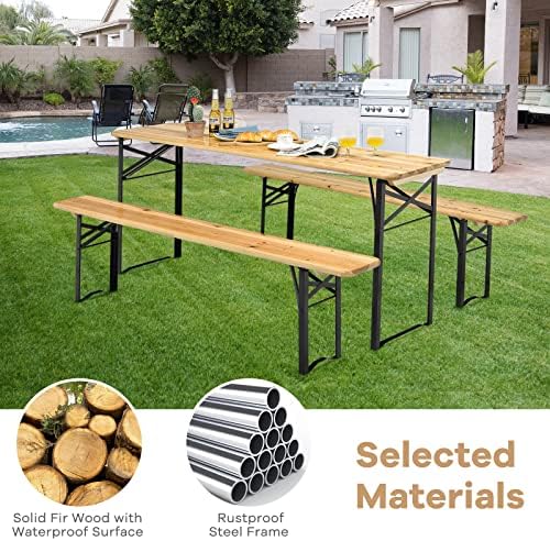 🏕️Wide Wooden Tabletop: Made of solid fir wood, the smooth surface of the beer table and benches are waterproof for easy cleaning. Besides, the tabletop is wide enough to hold enough food, drinks and more, which is perfect for gathering your family or friends around the table for a party time.