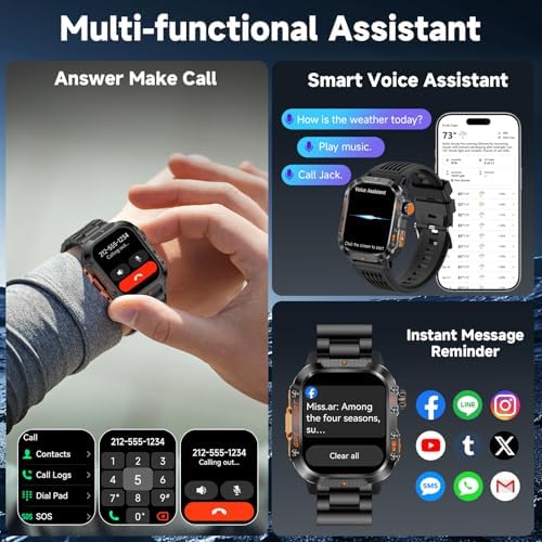 ⌚【Bluetooth Calls and AI Voice Assistant】- The fitness watch uses Bluetooth 5.3 technology with built-in HiFi stereo speakers and a microphone. Connect via Bluetooth (compatible with most Android 5.1 & iOS 8.2+ smartphones) to receive/make calls. The app stores contacts for constant connectivity. Get real-time notifications for calls/messages (WhatsApp, Facebook, Instagram, etc.). Use the voice assistant to call or play music, streamlining daily activities like driving.