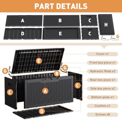 PRACTICAL DESIGN: The deck box has a hydraulic holder design, which can prevent your hand from being caught when you open and close the box to ensure safety. Meanwhile, there is a support bar designed inside the lid, which can enhance the durability of the storage box.