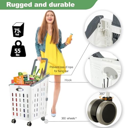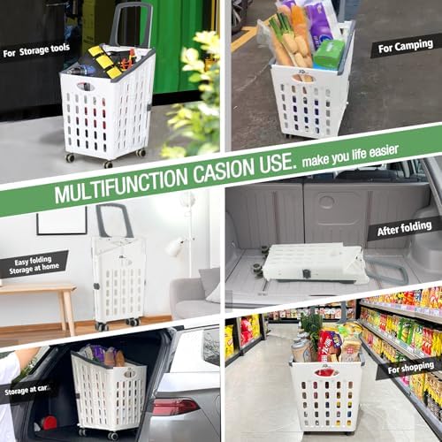 Plastic shopping folding cart, cart for shopping items, sundries, clothes. Oversized rear wheels are removable for stability on the road and front wheels swivel 360°. Pushchair handle can be specially designed (non-slip, more durable), multi-functional shopping book trolley, adults and children can use, and can climb the stairs, saving energy and time. Volume capacity 55.1Lb