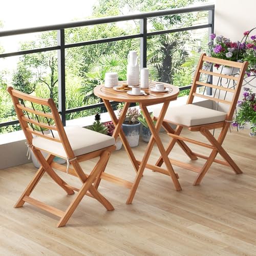 Crafted from solid acacia wood, this folding bistro set features a round table and 2 patio chairs, each featuring soft cushions for ultimate relaxation. With a sturdy framework, this patio bistro set supports up to 400 lbs per chair and 180 lbs for the table, making it a reliable and attractive choice for any outdoor setting. Additionally, this foldable outdoor table and chairs set is perfect for compact areas, allowing easy storage or reconfiguration according to your needs.