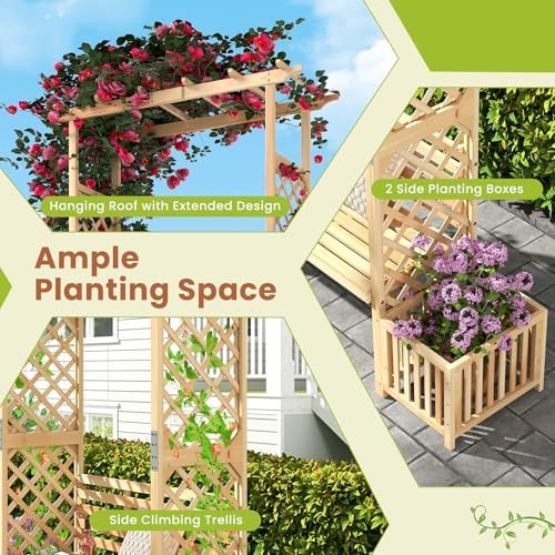 Sufficient Planting Space: This arc top bench trellis is designed with a wide roof with extended bars, which can be used to support climbing plants, creating a lush green canopy. Additionally, the 2 side planting box and climbing trellis providing more space for your plants to grow.