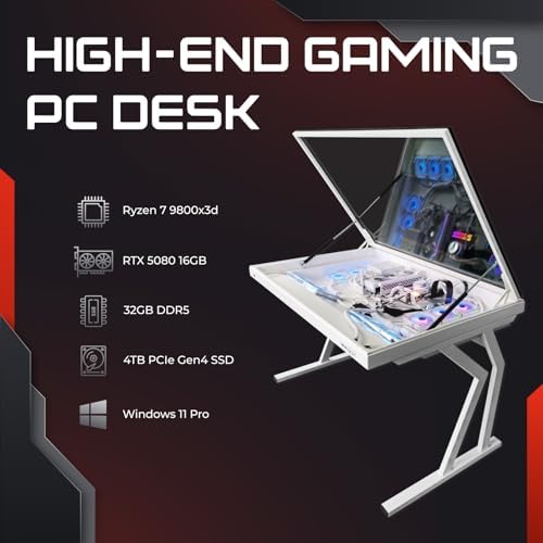 Built-to-order high-performance PC integrated inside the desk Ryzen 7 9800X3D, RTX 5080, 32GB DDR5 RAM, 4TB PCIe Gen4 SSD Tempered glass top with gas-lift mechanism for easy access RGB lighting & liquid cooling for quiet and cool operation Designed for gamers, creators, and high-performance users Professionally assembled and tested in California Gaming PC