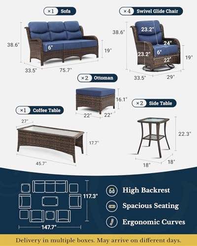 All-Weather Materials: A heavy-duty metal frame—robot-welded for 350+ lbs support and stability, with rust/chip/corrosion-resistant e-coating—ensures years of outdoor use. Handwoven PE rattan resists cracking, fading, warping in sun, rain, snow. Cushion covers is made of 100% solution-dyed olefin yarns for fade-proof color (1,000+ hours direct sun), water-resistant, quick-drying. For longevity, store or cover cushions in heavy rain/extreme weather