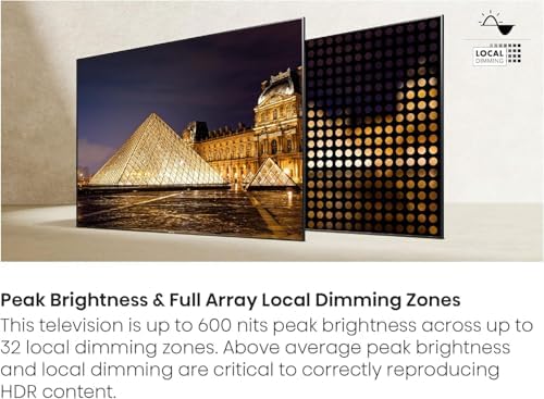 Peak Brightness / Full Array Local Dimming Zones: This television offers up-to-600 nits peak brightness across up to 32 local dimming zones. Above average peak brightness and local dimming are critical to correctly reproducing HDR content.