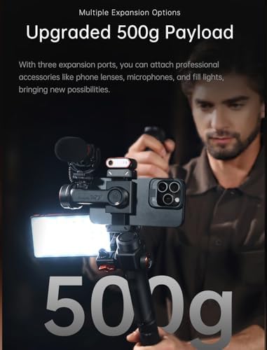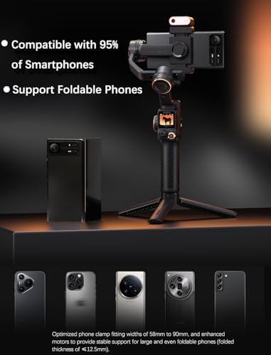 【Upgraded 500g Payload】: Compatible with the most of Smartphones.Optimized phone clamp fitting widths of 58mm to 90mm, and enhanced motors to provide stable support for large and even foldable phones .