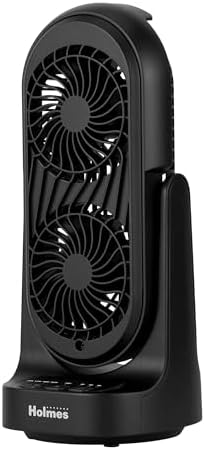 Holmes — Stay cool and comfortable with the Holmes 13″ DuoBreeze Dual Blade Desk Fan, designed to deliver powerful yet quiet airflow in a compact, space-saving design. Perfect for desktops, tabletops, and small spaces, this fan features dual blades and three speed settings for customizable comfort. The 60° oscillation and 45° adjustable tilt head let you direct airflow exactly where you need it, while the convenient 8-hour timer allows you to set your desired cooling duration — ideal for nighttime use. The innovative CleanBreeze design makes maintenance simple with a removable front grill for easy cleaning of the blades and fan interior, ensuring fresher air circulation. Despite its powerful performance, this fan operates quietly at just 50 dB, with an airflow of 100 ft³/min and a velocity of 13 ft/sec, making it perfect for bedrooms or home offices. Compact, durable, and effortless to use, the Holmes DuoBreeze Fan combines modern performance, reliable construction, and sleek style for everyday comfort.