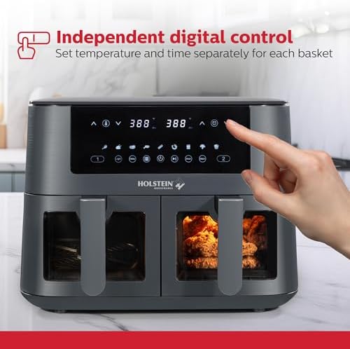 FUNCTIONAL FEATURES: Easy touch independent digital control panel with time-saving cooking presets. 60-minute time with auto shut-off feature. Two 4.2QT frying baskets with non-stick coating. Cool touch handle for added safety and viewing windows let you easily monitor the cooking process for each recipe