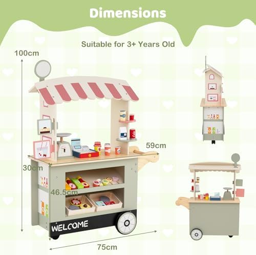 【Perfect Gift & Develop Skills】 Give the gift of endless entertainment to your toddler! This wooden dessert shop play market is a sight to behold, with its adorable canopy, eye-catching advertising signboard and many accessories. Additionally, they can learn entrepreneurship, problem-solving, counting, social interaction, critical thinking skills. Get ready for a feast of fun!