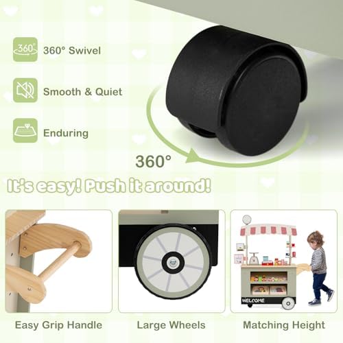 【Easy to Move】This kids dessert play stand is designed for non-stop action! With a smooth & quiet 360° swivel caster and 2 large wheels, this kids food truck with wheels glides effortlessly wherever your child desires. And with an easy-grip handle, they’ll be in full control of their culinary adventures.
