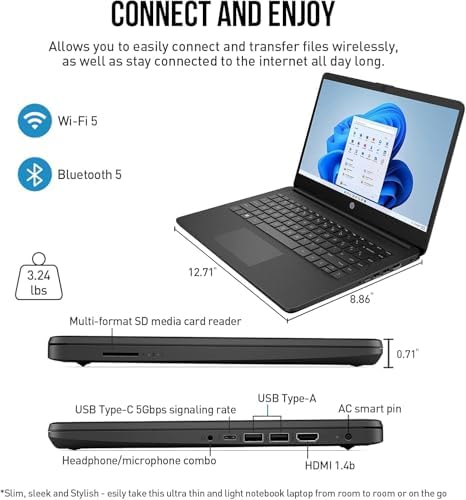 [Features]: Microsoft 365; Windows 11 Pro; HP True Vision 720p HD Camera; 802.11 Wireless-AC (2×2) and Bluetooth 5.0; Quite and cool, experience blazing-fast speed and efficiency with this small and portable HP 14 inch laptop.