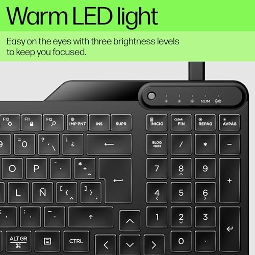 Introducing the HP 400 Backlit Wired Keyboard: a compact yet full-function keyboard with numpad, made for seamless transitions between home and office—or day and night. Experience unmatched comfort and productivity, especially during late-night work sessions, as this keyboard features a warm white LED backlit glow and whisper-quiet keys. Designed for comfort with three levels of adjustable LED brightness and a tilt range of 0–6 degrees, ergonomic control is literally at your fingertips. You can further customize your workflow with 12 programmable keys. Designed with real-life in mind, the HP 400 Backlit Wired Keyboard is spill-resistant and sanitizable1. Type with confidence knowing your HP Wireless Keyboard is backed by HP’s 2-year limited warranty2. Featuring multi-device and multi-OS connectivity, the HP 400 Backlit Wired Keyboard comes equipped with a USB-C® cord and USB-A adapter. The HP 400 Backlit Wired Keyboard is also crafted from 50% post-consumer recycled materials and packaged in FSC certified, all-fiber, plastic-free packaging—so you can make a positive impact on the planet while elevating your productivity.