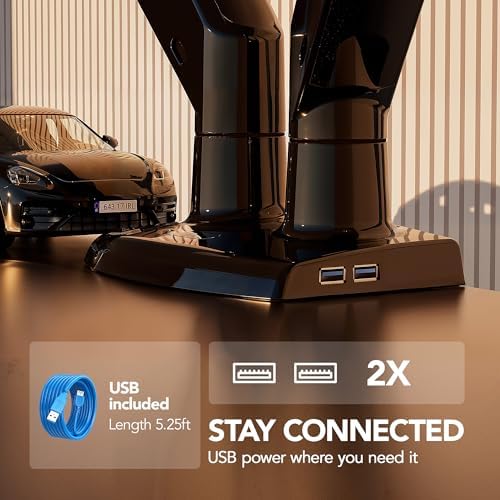 Flexible Mounting and Convenient Charging: The dual monitor stand supports both clamp and bolt-through grommet mounting for desk thicknesses up to 3.54″. The hole for grommet mounting should be 0.39″ to 1.97″ in diameter. With two built-in USB ports and a 5.25 ft USB cable, this stand provides an easy way to charge your devices.