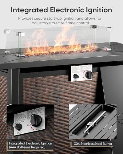Warm Bonfire and Auto-ignition Device:The gas fire pit table has a heat output of 50,000 BTUs and is equipped with an integrated electronic ignition that adjusts the flame to your desired temperature with the control button. Continuously provide you with enough warmth.