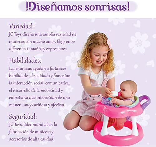 It’s time to let baby move around in her lovely walker! The JC Toys Lots to Love Babies walker Gift Set includes the cutest 14-inch vinyl doll and everything you need to get her moving. Our Baby Doll sits in her walker with real wheels and is ready for fun! Soft Fabric seat is easy to use, and keeps your baby safe. Extra accessories make play time even more fun! Her accessories are made of strong and durable plastic for easy cleaning with mild soap and water. Lots to Love Babies is manufactured directly by our company, JC Toys, a world leader in doll manufacturing. JC Toys is a family run and operated business with origins dating back to 1982 in south-east Spain – one of the top major toy-making and design centers in the world. Today, you can find 100s dolls, playtime accessories, and more by JC Toys. Add smiles to a young child’s face today by adding this Nursery La Newborn to your cart now, so it can be ready for checkout and shipment asap – thank you!