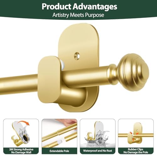 KAMANINA Curtain Rods No Drilling for Windows 32 to 86 Inches, 5/8 Inch Diameter Adjustable Single Curtain Pole with Adhesive Brackets, Gold