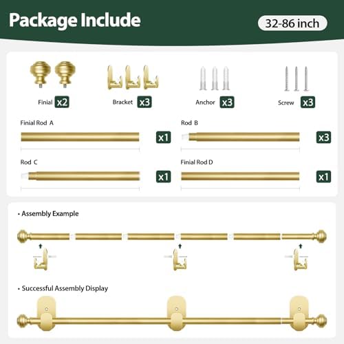 Adjustable Length: Featuring a new spilicing and telescoping design with a tube diameter of 0.6mm, each section is approximately 16 inches long, allowing the total length to be adjusted between 32 and 86 inches. The package includes 5pcs 5/8-inch outer rods, 1pcs 1/2-inch inner rod, 3pcs adhesive brackets, 2pcs finials, and 3pcs screw sets