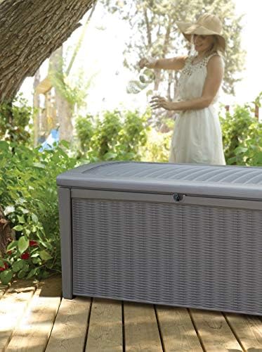 DURABLE KETER DECK BOX: This deck storage box is constructed from durable, weather-resistant resin and has an appealing rattan- or wicker-looking texture. It is available in brown or gray. The polypropylene construction prevents rusting, peeling, and denting