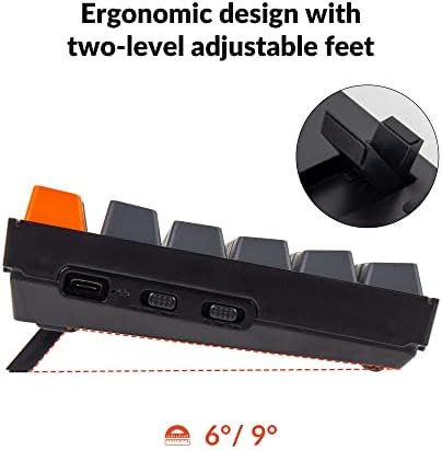 The K10 can last up to 240 hours (with backlight off) with a 4000 mAh big battery, which is one of the biggest in mechanical keyboards. Two level adjustable feet (6º and 9º) and inclined bottom frame provides a great ergonomic support for long lasting typing comfort.
