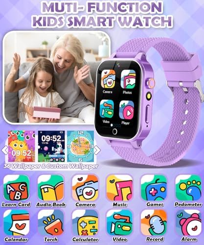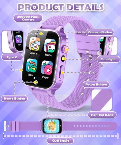 Multi-function Smart Watch: This kids smart watches for girls is packed with features: 26 games, 13 alarms for habit tracking, a camera, flashlight, music player, audiobook, word cards, pedometer, and more. It operates without an internet connection and doesn’t require app downloads, making it safe and easy for any child to use without exposure to inappropriate content. The watch has a 1.5″ screen