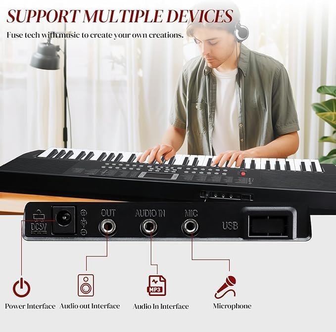 STRONGER FUCTION: The classic 61-key piano keyboard supports the microphone, which can performance more rich music. It also features Program, Sustain, Chord, Sync, Vibrato, Fill-in, Record and Play functions. The interface of multimedia external functions is complete, and it is compatible with many existing equipment