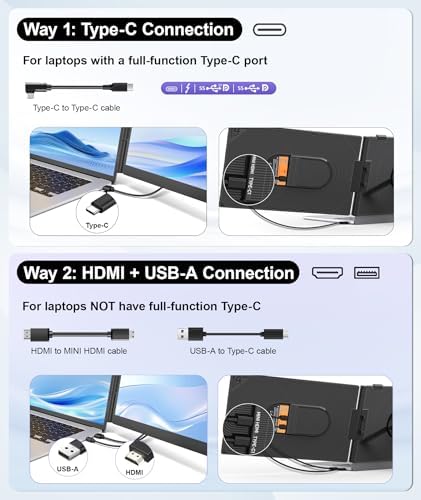 【Effortless Setup, No Driver Required】Our portable laptop monitor features an effortless connection, no driver required, only need one second to set up. If your laptop has a full-function USB-C port, connect the screen and your laptop with the USB-C cables directly. If your laptop does not have full-function USB-C ports, you can easily connect the screen to your laptop using an HDMI and a USB-A cable. All the necessary cables are included in the package. Simple and seamless connection.