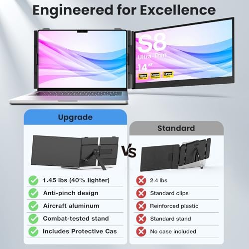 [2025 Upgraded: Ultra-Thin & Ultra-Light! ]This Laptop screen extender is just 0.24-inch thick – thinner than your phone! Weighing only 1.45 lbs, it’s a massive 30% lighter than before – lighter than two 12-oz Coke cans! This feather-light, ultra-slim design fits effortlessly into the included carrying case. Instantly boost productivity with extra display real estate anywhere.
