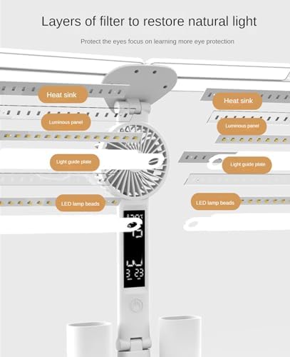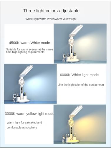 Our LED desktop desk lamp has four arms that can swing horizontally and vertically 180 degrees, ensuring that light can flexibly reach any position and provide you with precise lighting. Equipped with multiple lighting modes, short press the light switch to switch between warm white, natural white, and cool white color temperatures, long press to infinitely adjust brightness to meet different lighting needs. Whether it’s reading, writing, or work, it can provide suitable lighting. In addition to its lighting function, this desk lamp also has practical features such as a fan, pen holder, clock, calendar, and temperature display, providing you with a convenient user experience. By charging with the included USB cable, the desk lamp can be used freely anywhere without power restrictions.